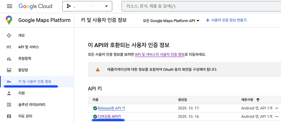 2. 실배포용은 문제가 발생하지 않는다. 디버깅용 api키를 클릭해서 정보를 확인한다.