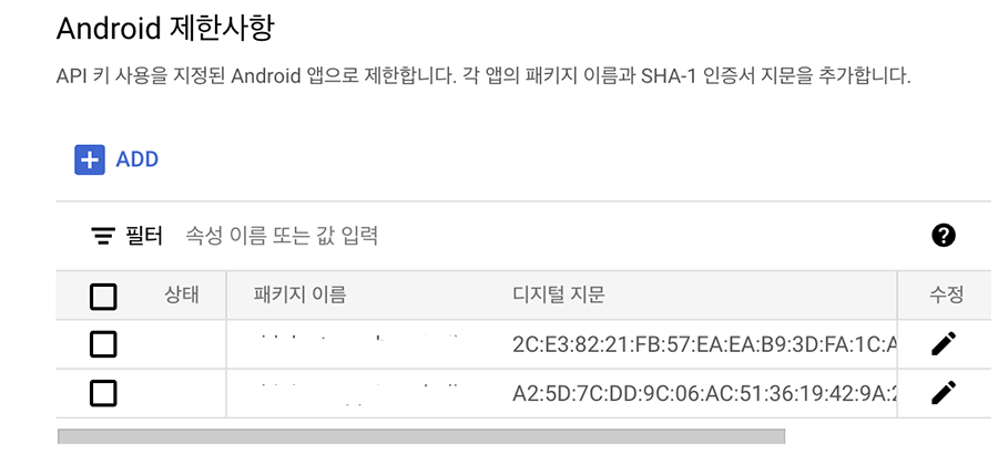 3. Android 제한사항에서 ADD 버튼을 클릭 후 패키지이름과 디지털 지문을 새로 추가해주어야한다.