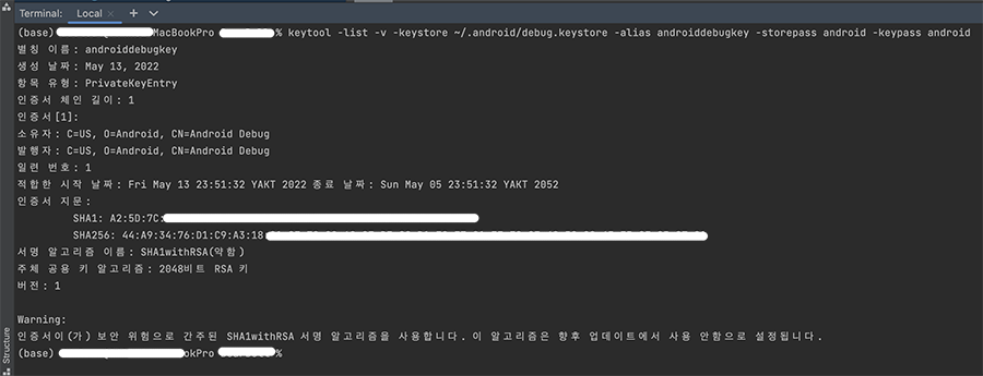 5. 디버그용 인증서 지문 생성완료 되면 SHA1 부문의 값을 패키지이름과 함께 디지털 지문으로 등록해준다.