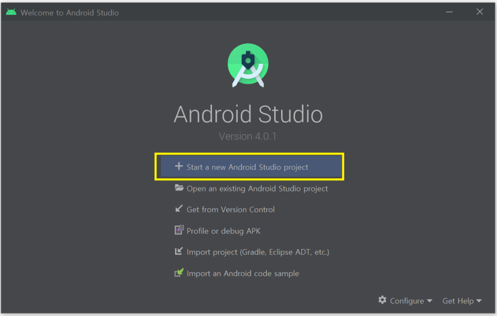 안드로이드 스튜디오를 다운 받아 설치 후 실행하면 아래와 같은 팝업창이 노출됩니다.