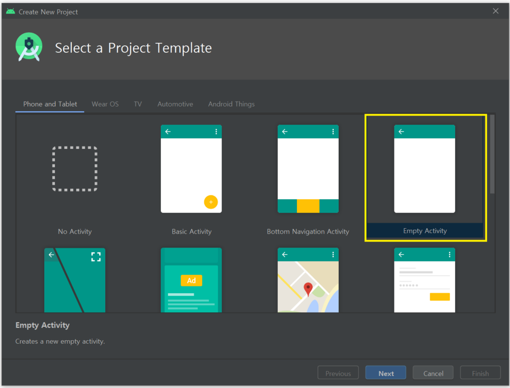 2. 프로젝트 템플릿을 선택한다. (가장 기본적인 Empty Activity)를 선택 후 Next 버튼을 클릭합니다.