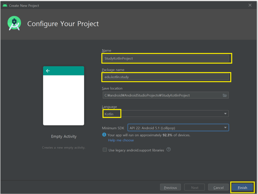 안드로이드 스튜디오 코틀린 프로젝트 생성방법