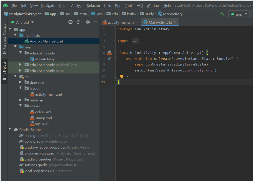 프로젝트 구성을 살펴보니, 기존 Java 언어로 개발했던 구성과 동일합니다. 다른점은 MainActivity 클래스를 살펴보니 파일 확장자가 java에서 kt로 변경되었습니다. 이동통신 KT가 연상되는 이유는 뭘까요ㅎㅎ 큰 변화가 없어서 코틀린 언어 시작의 거부감은 해소되었네요.