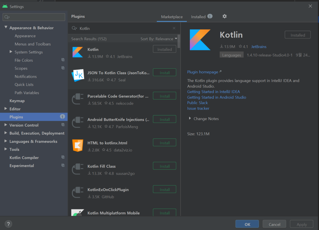 안드로이드 스튜디오 4.0.1버전을 사용중이라면, IntelliJ 관련하여 별도의 플러그인을 설치할 필요는 없습니다. 이미 설치가 완료되어 있습니다. 설치가 되어 있지 않다면 안드로이드 스튜디오 상단 메뉴에서 File – Settings – Plugins 선택 후 kotlin으로 검색하여 설치버튼을 눌러 설치하세요.