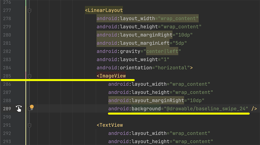 오류원인은 ImageView에서 백그라운드 이미지로 사용된 baseline_swip_24 아이콘을 찾을 수 없기 때문이다. 그이유는 안드로이드 버전이 낮은 경우 백터이미지를 읽어오지 못하는 문제가 있다.