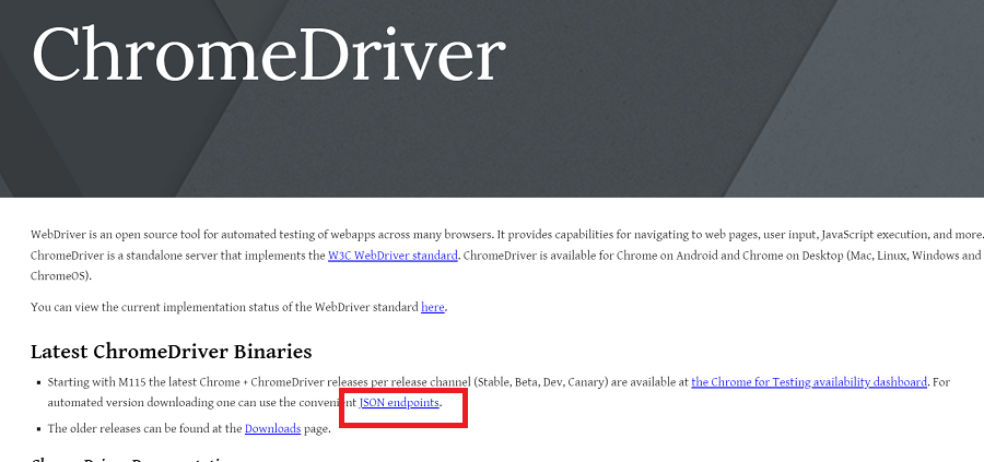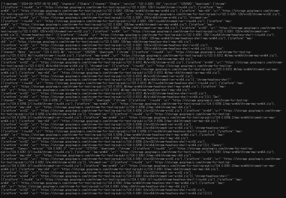 JSON endpoints 클릭하여 들어가면 아래와 같이 json타입의 데이터가 나타난다. 여기서 운영체제에 맞는 크롬 드라이버 주소를 복사해서 브라우저 주소창에 복사해주면 다운로드 받을 수 있다.
