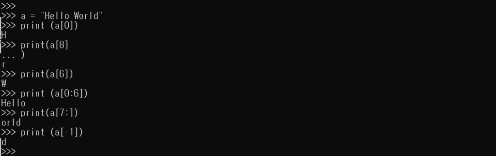 a = "Hello World" print (a) print (a[0]) print(a[6]) print (a[0:6]) print(a[7:]) print (a[-1]) print(a[:4])