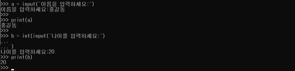 사용자로부터 입력값을 받기위해 input문을 사용합니다. 자료형을 지정하지 않는 이상 기본적으로 문자열 형태로 입력값을 받아들입니다. 코딩 중에 실수로 엔터키를 눌렀을 경우 파이썬은 스스로 코드가 완성되지않았다고 판단되는 경우 …로 표시되며 이어서 코드를 작성할 수 있습니다.