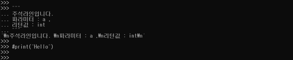 파이썬에서 주석은 해시기호(#)을 사용합니다. 여러 줄을 주석처리해야하는 경우 삼중 따옴표(“””)를 사용합니다.