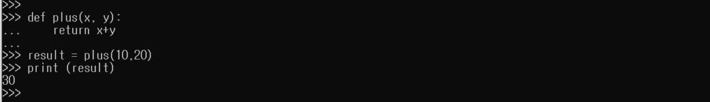 >>> def sum(x,y): ... return x+y ... >>> print(sum(10,20)) 30