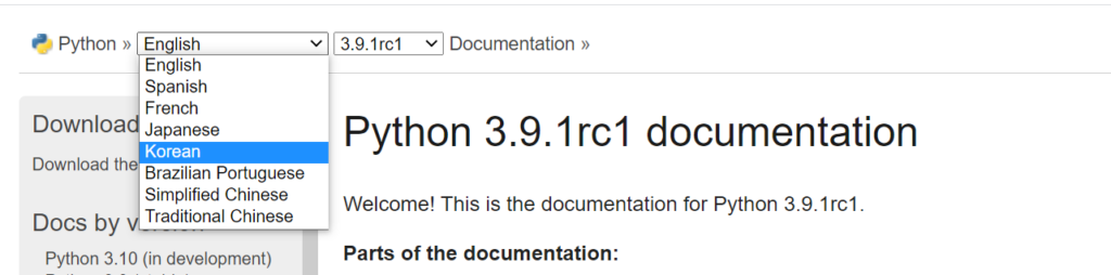 파이썬자습서의 경우 사이트에 들어가면 기본 언어는 영어로 설정되어있습니다. 한국어로 변경하여 볼 수 도 있습니다.