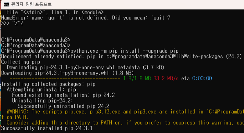 - python -m pip install -upgrade pip 명령어를 실행하여 업그레이드 해준다.