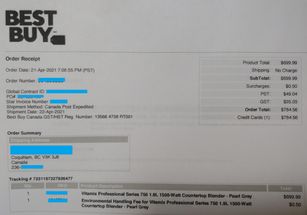 BEST BUY(베스트바이)에서 구매했던 Vitamix Professional SEries 750 1.9L 1500-Watt Countertop Blender-Pearl grey 제품의 구매내역 영수증이다. 믹서기 하나에 $784.56이라니…그냥 신기할 뿐이다.