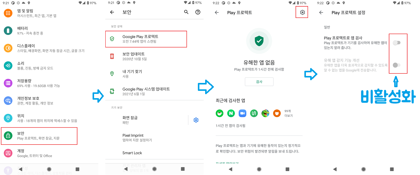휴대폰 설정 > 보안 > Goole Play 프로텍트 > 상단 톱니바퀴 모양 아이콘 클릭 > Play 프로텍트 설정