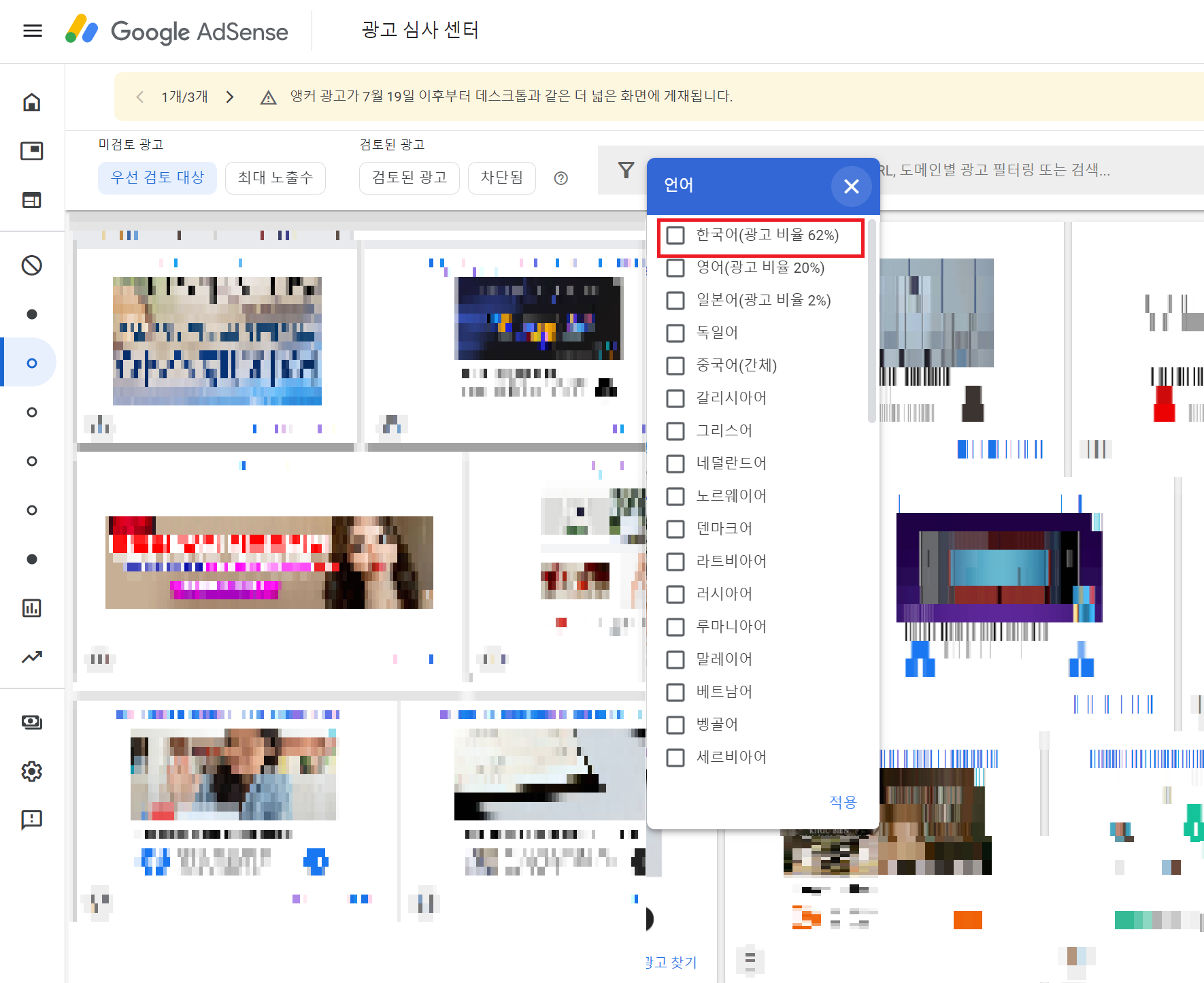 검색어 입력하는 창을 클릭하면 “게시자 도메인”,”최신 광고”, “광고 네트워크”, “언어”, “크기”, “광고 유형” 의 카테고리를 선택할 수 있습니다. 언어를 선택하면 아래 스크린샷과 같은 언어 선택창이 나타납니다. 보시는 봐야 같이 저의 경우는 한국어 광고 비율이 62%입니다. 한국어 광고 비율을 끌어 올리고 싶은데 방법이 없을까요??? 한국어를 제외하고 모든 언어를 체크 후 조회하면 대상 광고가 천건이 넘고 하나씩 하나씩 차단 버튼을 클릭하여서 처리하기엔 노가다가 따로 없네요. 설마 매일 이 작업을 하는 분들이 있는 건 아니겠죠?????