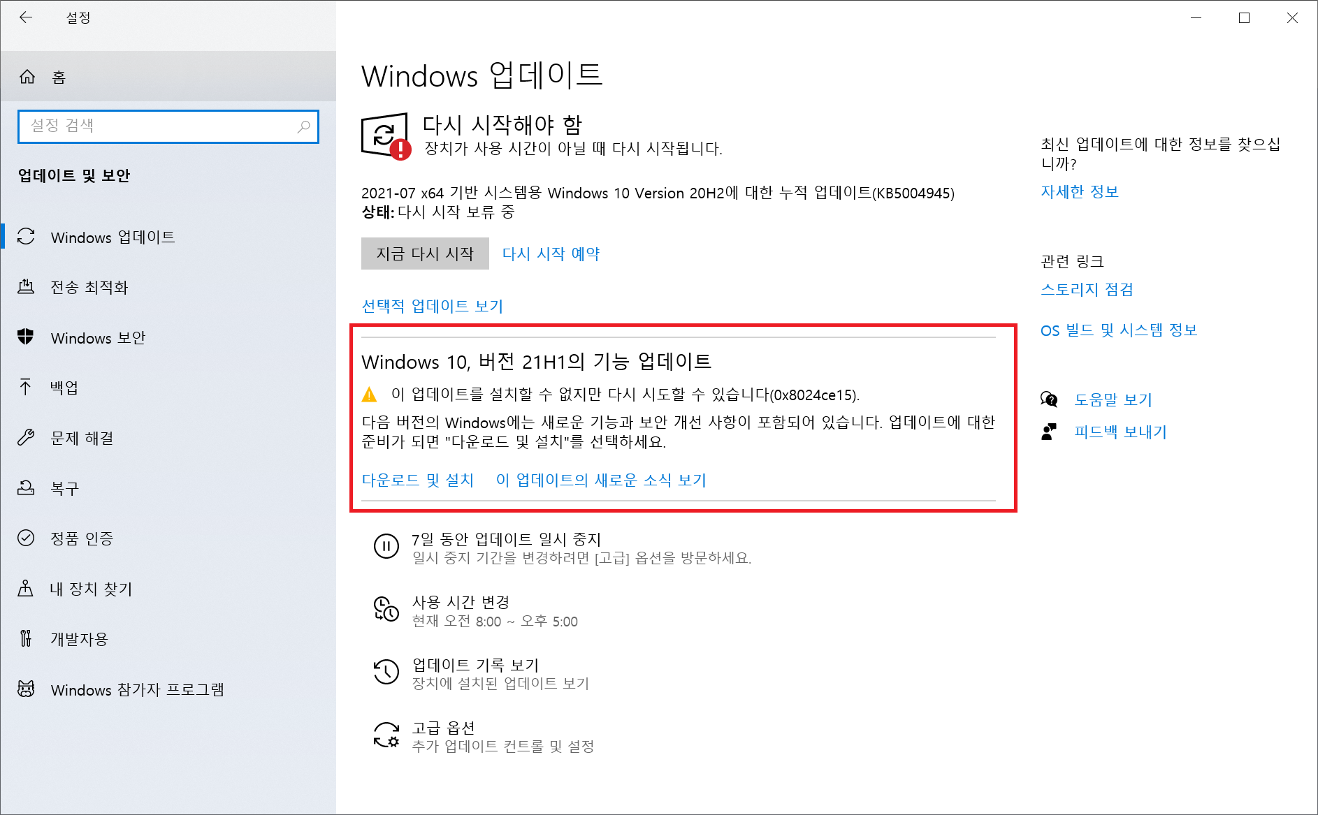 “Windows 10, 버전 21H1의 기능 업데이트”를 선택하여 설치하시면 됩니다.