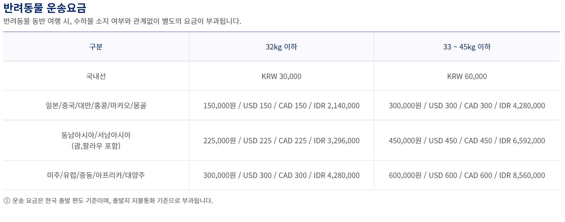 대한항공 반려동물 운송요금