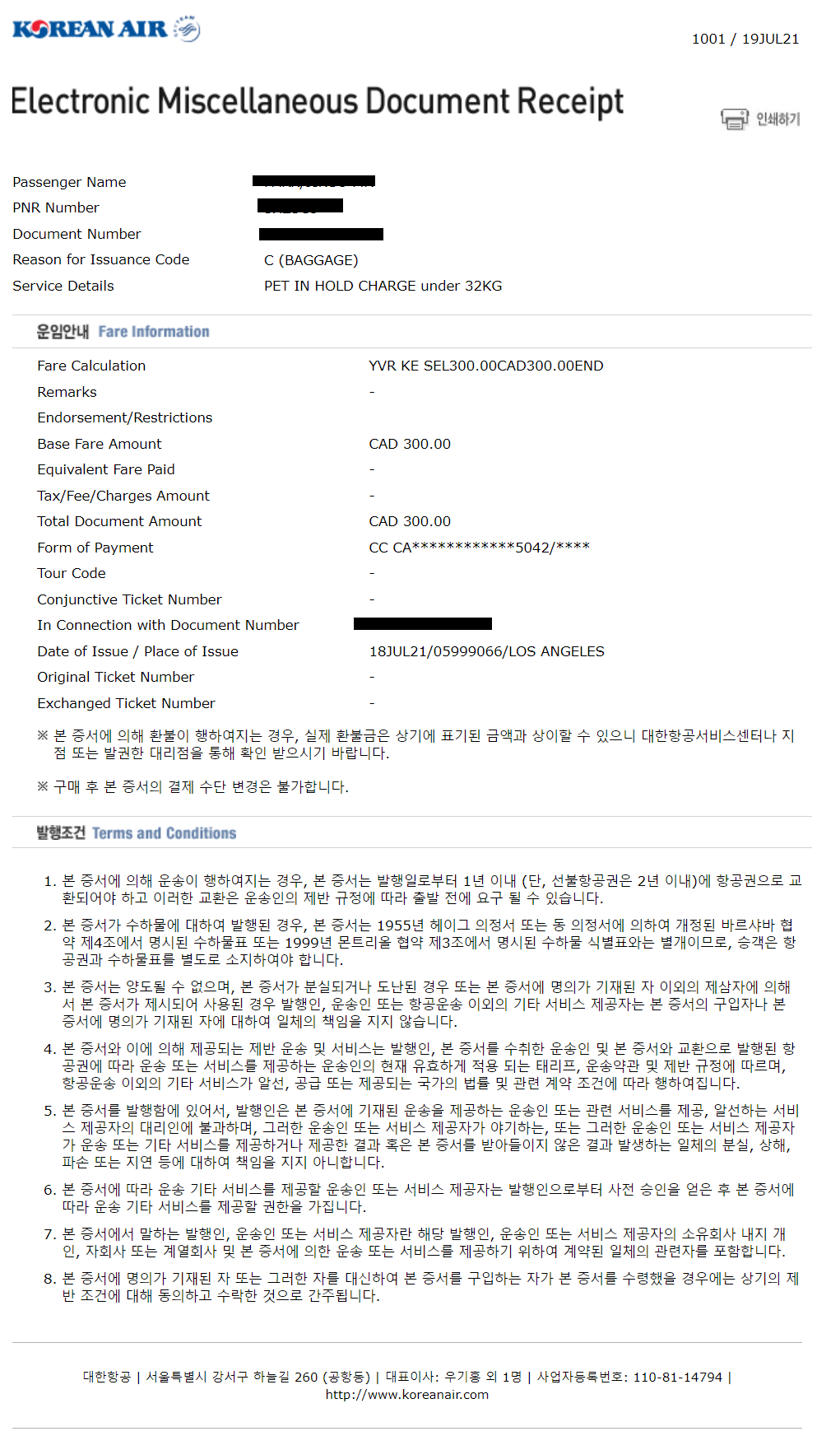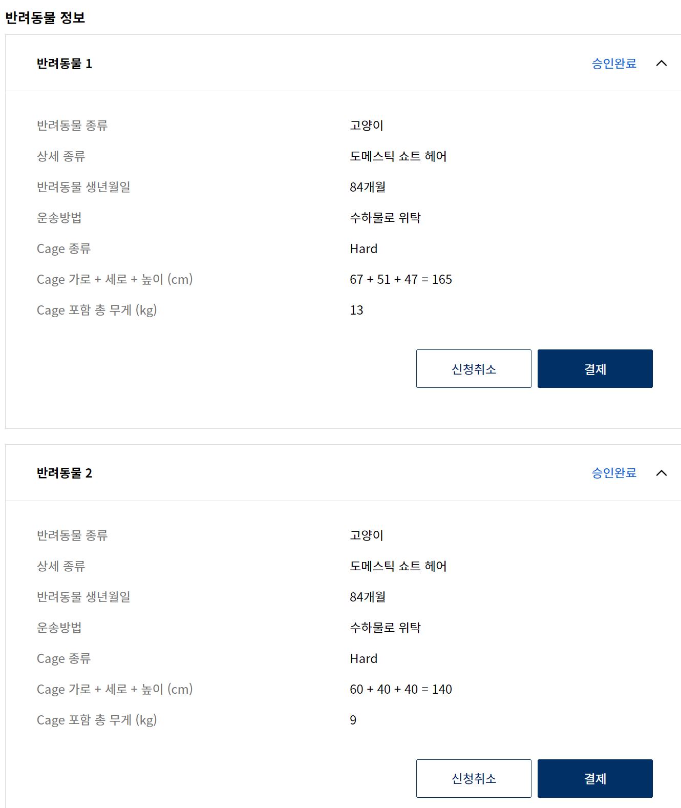 대한항공 티켓 구매후 반려 동물 동반 신청 후 대한항공에서 확약을 하게 되면 웹사이트에서 바로 결제할 수 있습니다.