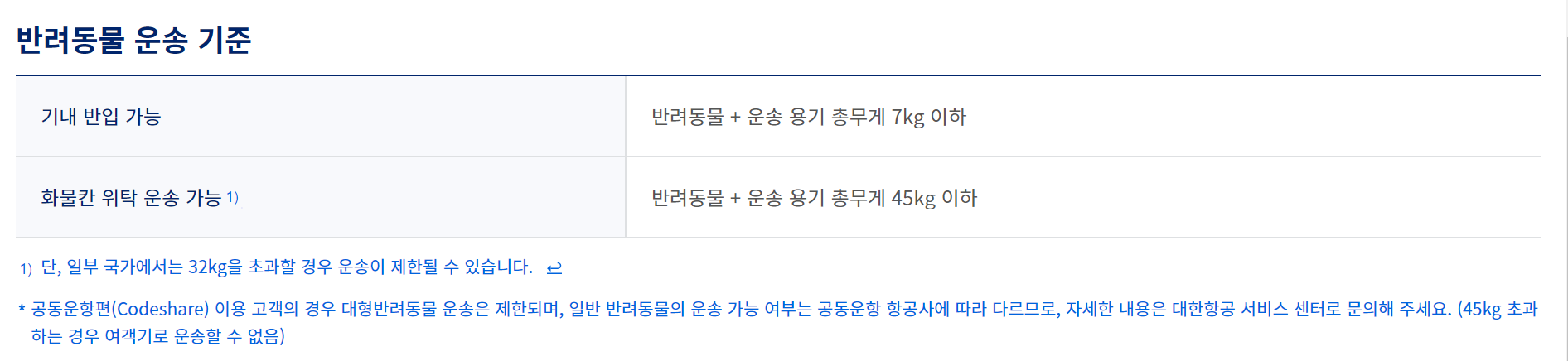 대한항공 반려동물 운송기준