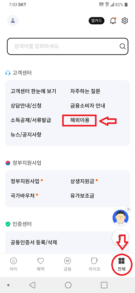 2. 스크롤을 내려서 “고객센터” > “해외이용” 메뉴를 클릭합니다.