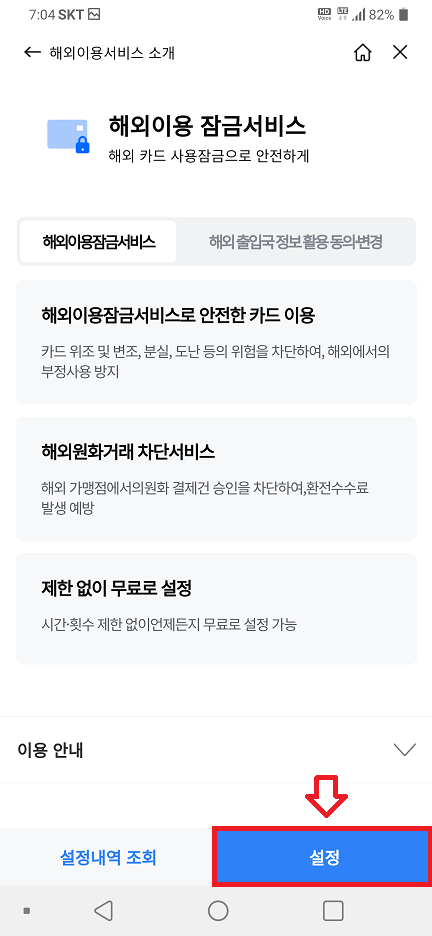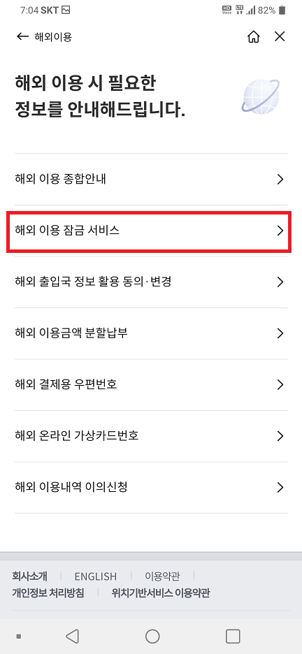 3. 스크롤을 내려서 해외이용 > 해외 이용잠금 서비스를 클릭합니다.