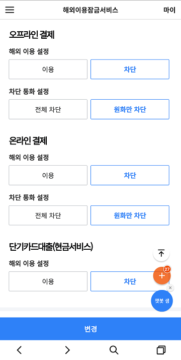 6. 오프라인 결제 및 온라인 결제 관련하여 이용 및 차단이 설정을 하시고 변경 버튼을 클릭합니다. 전체 차단을 선택하면 모든 결제가 차단됩니다.
