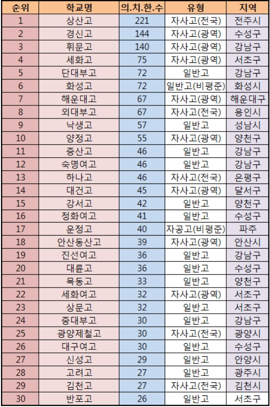 2021년 고등학교 순위 : 의.치.한.수 기준