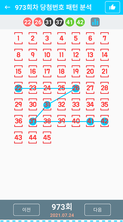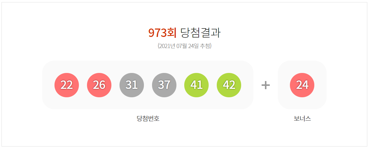 1등 로또 당첨번호는 22,26,31,37,41,42 (보너스 번호 24) 입니다