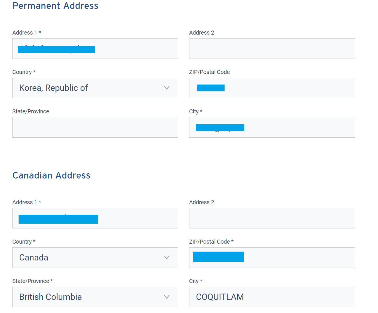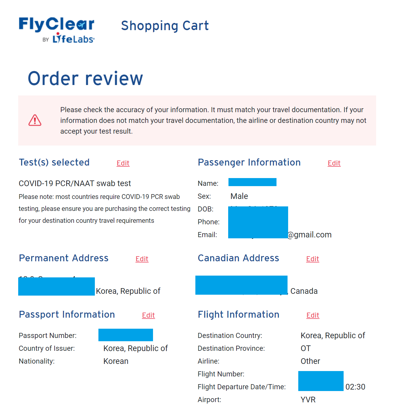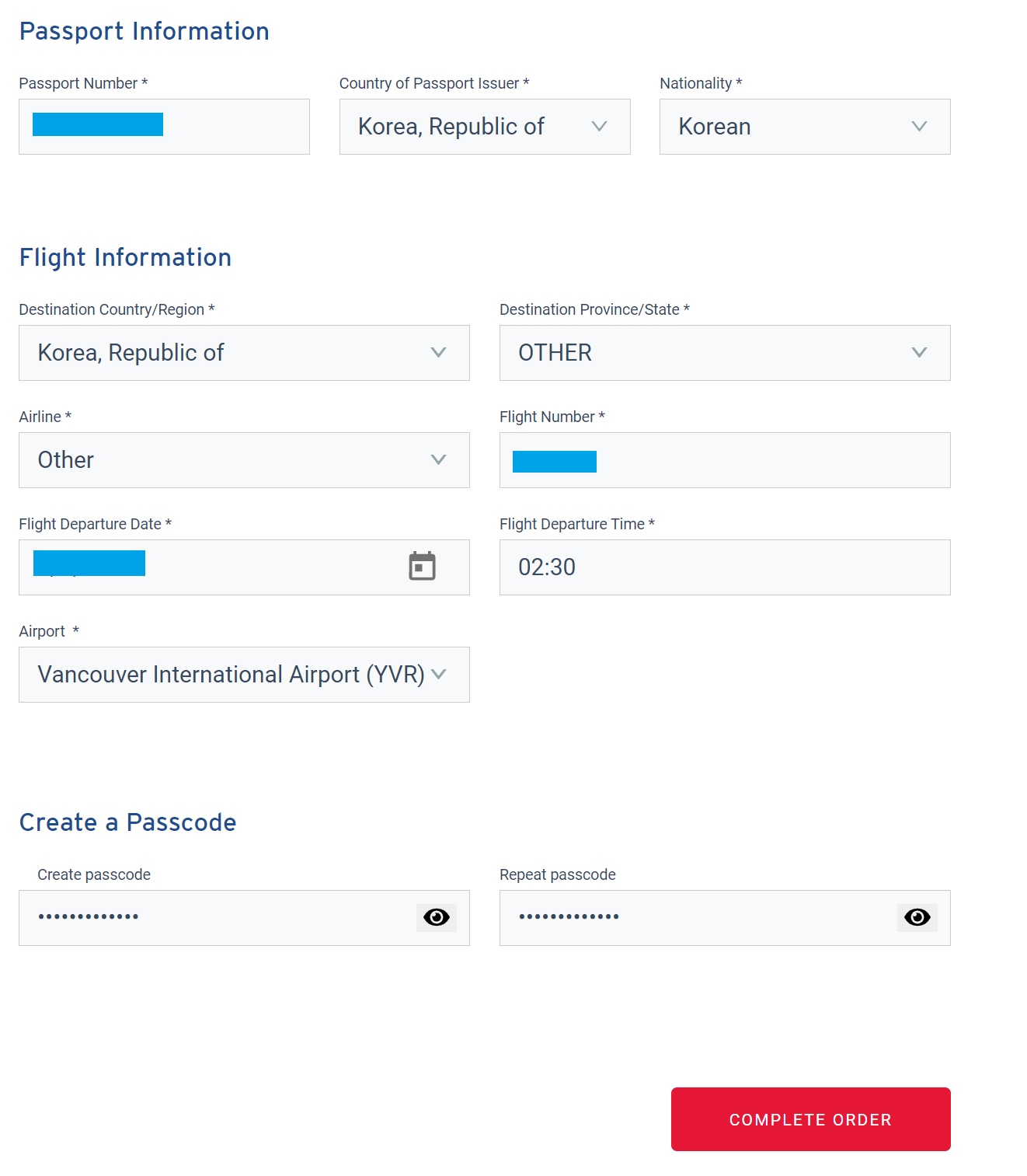 8. 승객의 개인정보 및 한국 주소, 캐나다 주소, 여권정보, 비행기 예약 정보 및 패스워드를 입력 후 COMPLETE ORDER 버튼을 클릭합니다. 이메일 주소는 PCR테스트 결과를 받아야 함으로 중요합니다.