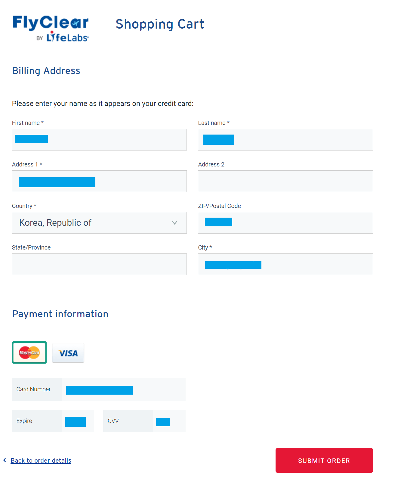 10. 카드 계산을 위한 개인정보 및 카드 정보를 입력 후 SUBMIT ORDER 버튼을 클릭합니다. 지불방법으로 마스터 카드와 비자카드 결제를 지원합니다.