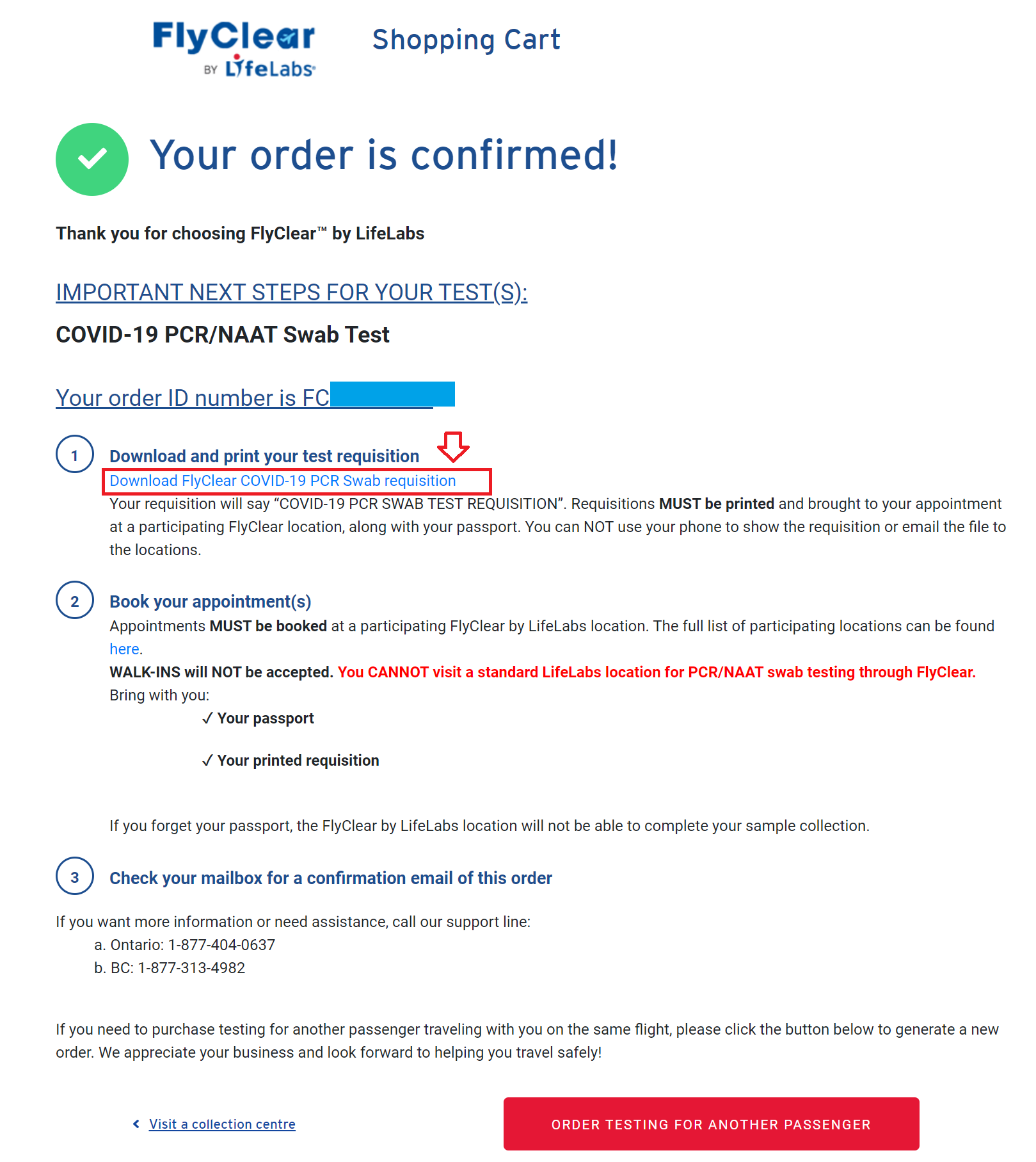 11. 예약이 완료되었습니다. order ID 확인 및 requisition은 샤퍼스에서 예약할 때 필요한 정보입니다. Download FlyClear COVID-19 Swab requisition을 클릭하여 PDF파을 다운 받은 후 반드시 인쇄해서 가져가야합니다.