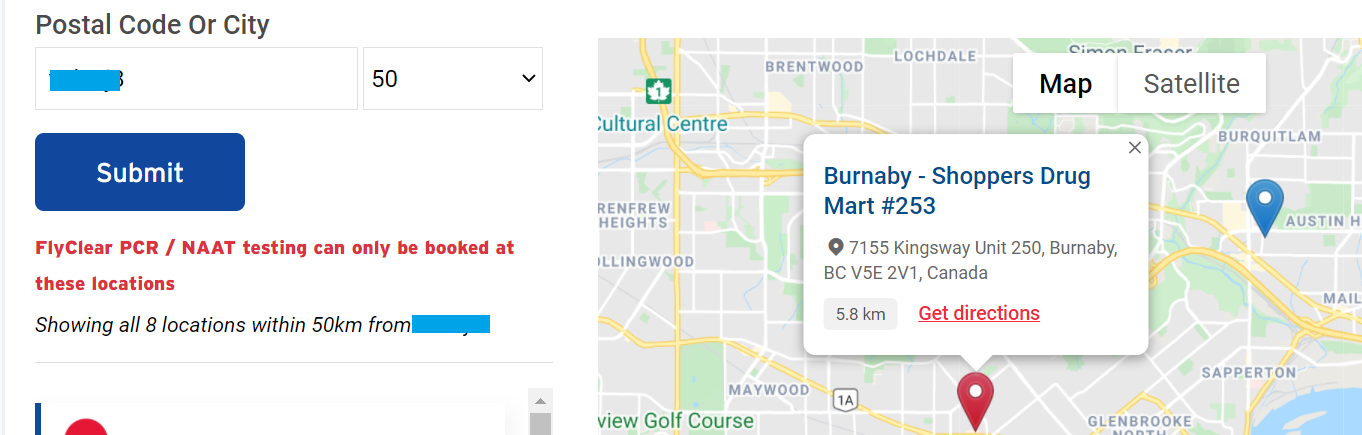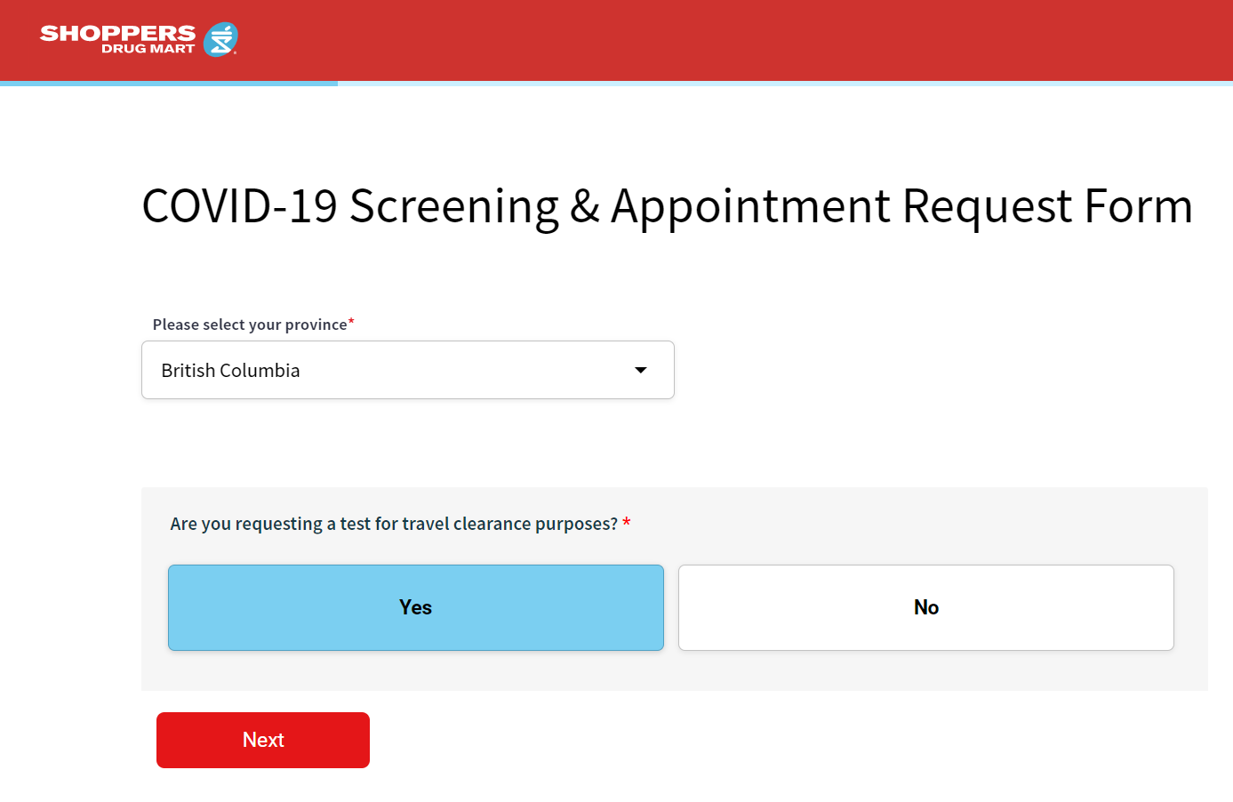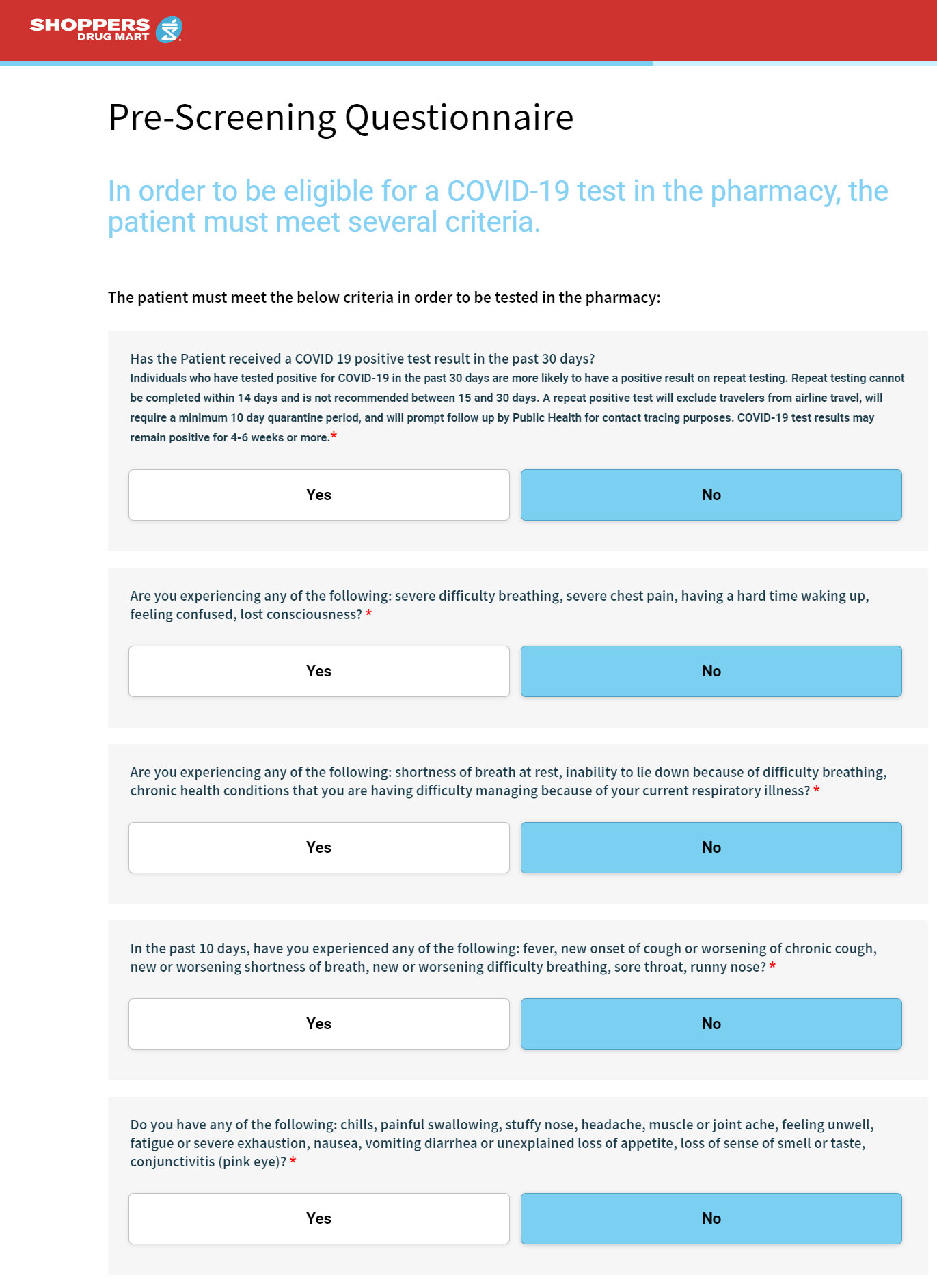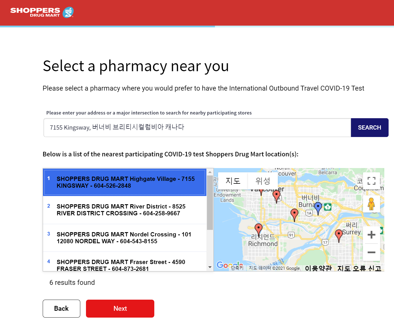 이제 PCR 검사를 받기 위한 장소에 대한 예약을 진행해야합니다. 거주지에서 제일 가까운 곳으 Shoppers(샤퍼스)로 예약하세요.