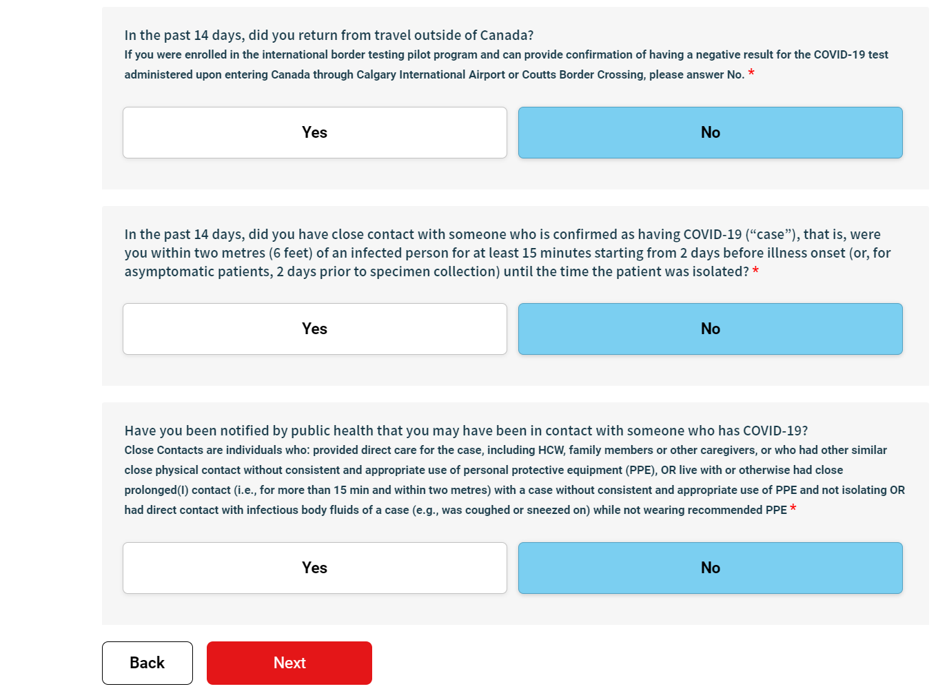 13. 사전 심사 설문지에 대한 답변을 선택합니다. 최근 코로나 19 증상 관련 질문에 모두 NO를 선택하세요