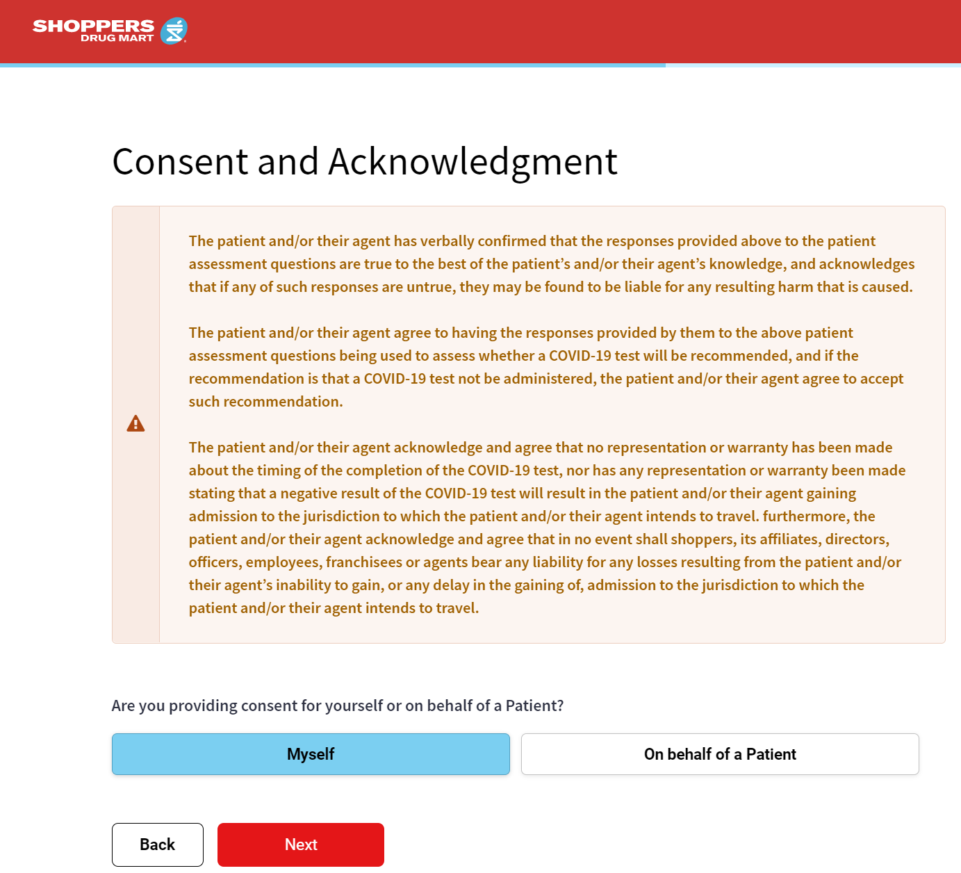 14. 동의 및 승인시, 본인을 위한 것이라면 Myself를 선택 후 Next를 클릭합니다. 대리진행(On behalf of a Patient)