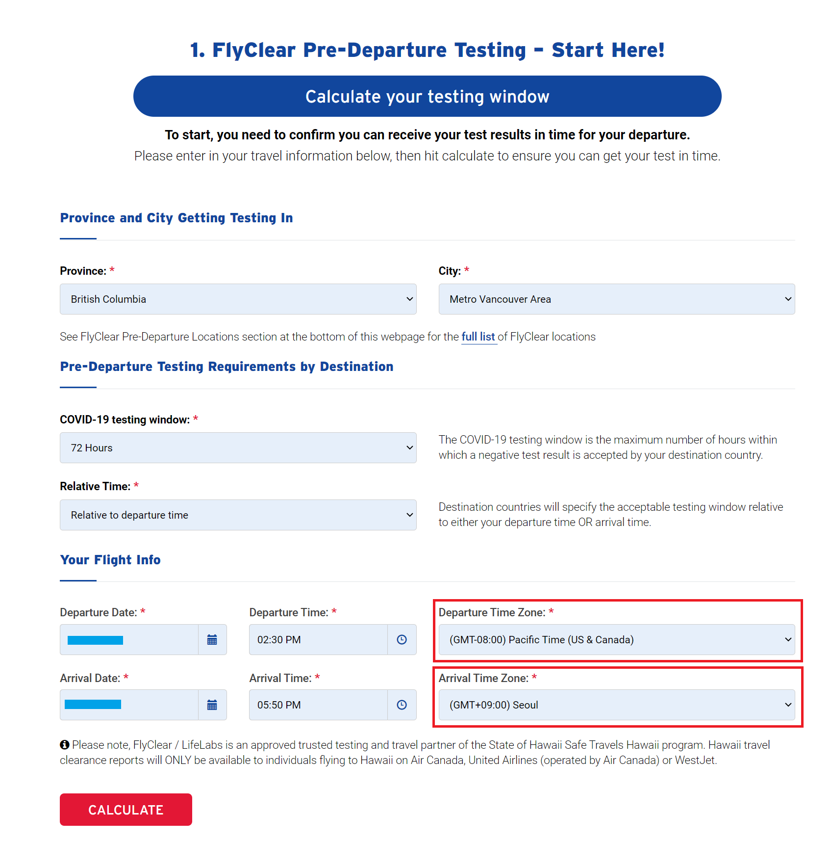 작성완료 후 CALCULATE 버튼을 클릭하면 언제 PCR테스트를 받아야하는지 계산해줍니다.