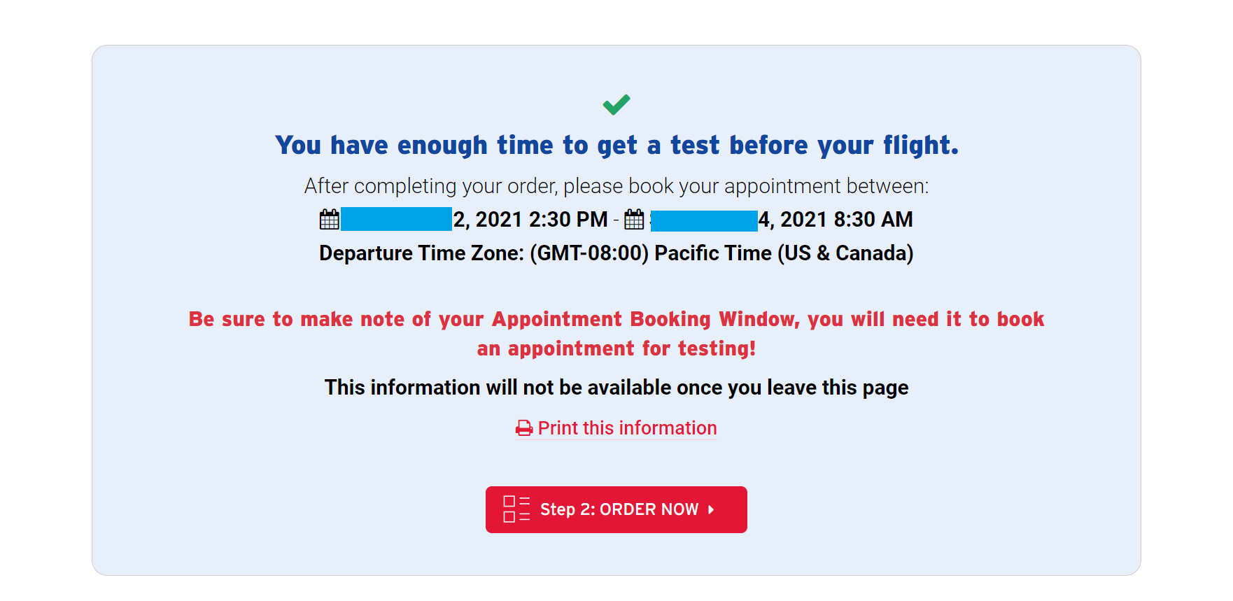 4. PCR 테스트를 받아야할 기간을 알려주니, 기록해 두세요. Step 2: ORDER NOW를 클릭하여 다음 단계로 이동합니다.