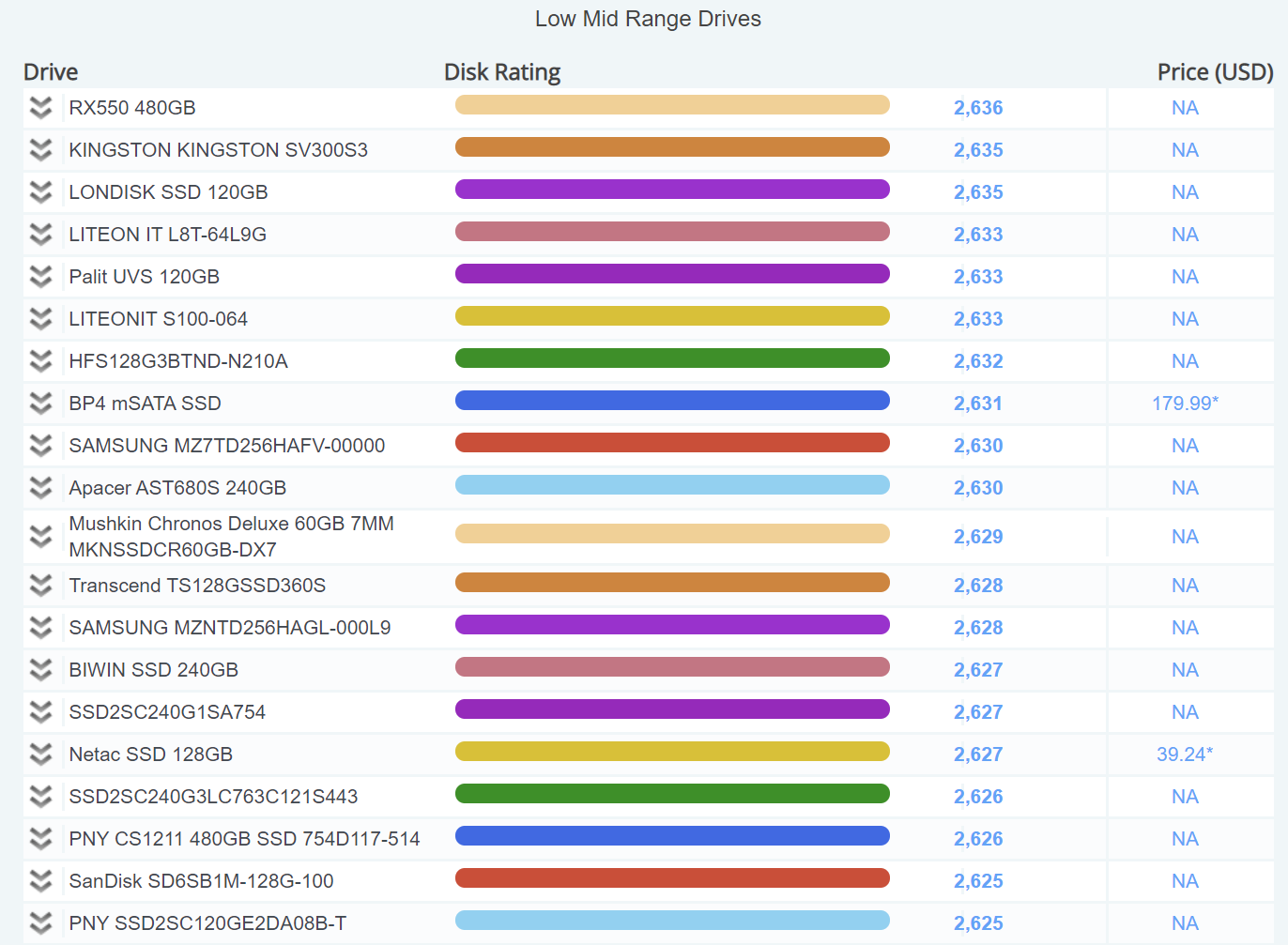 점수가 높은 드라이브는 일반적으로 RAM값(10,000 / 15,000)이 더 크거나 솔리드 스테이트 드라이브(SSD) 입니다.
