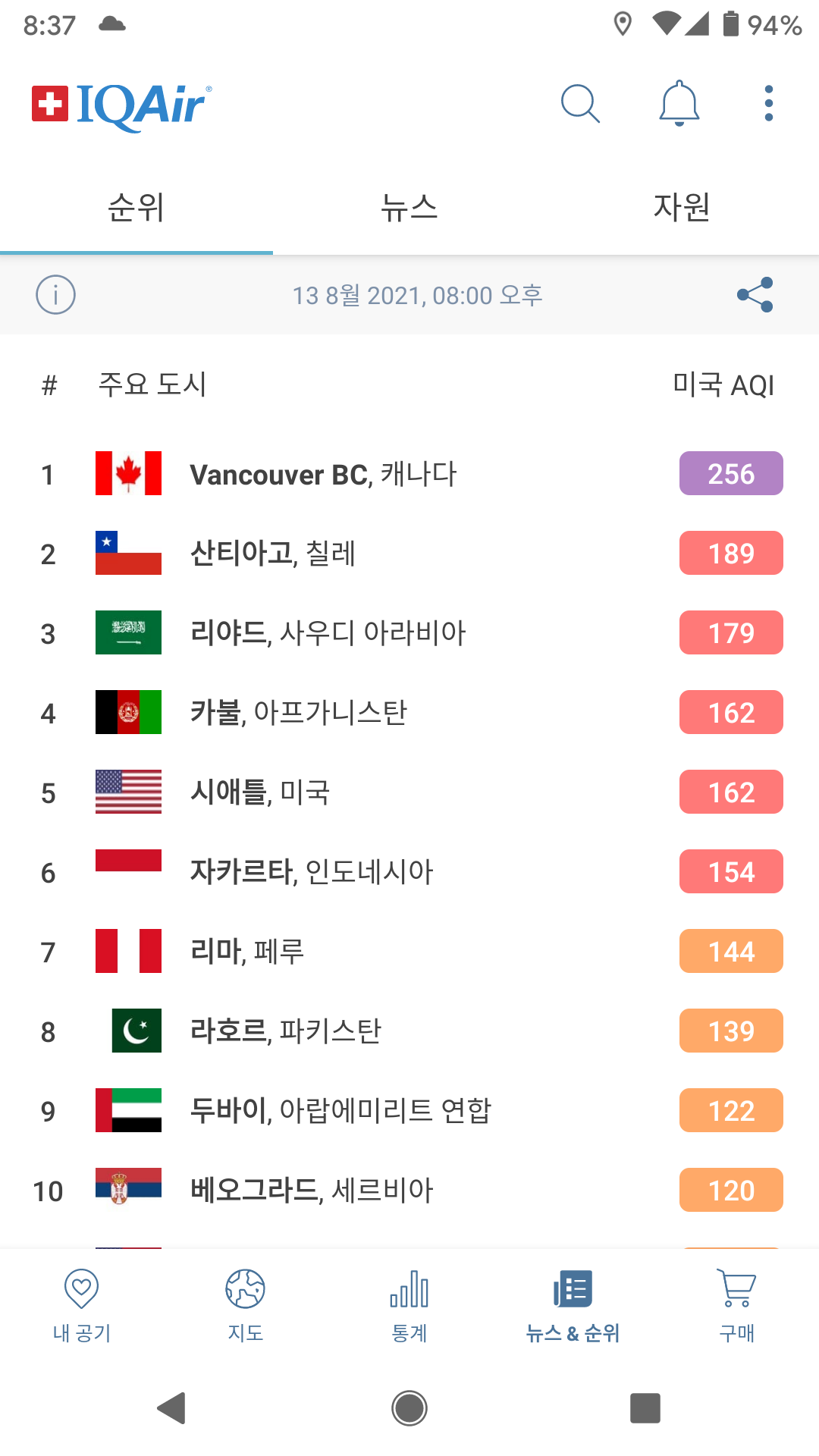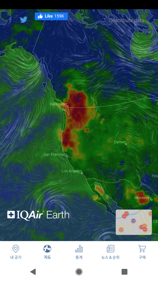 참으로 오랜만에 에어비주얼 앱을 실행해보았습니다. 캐나다 밴쿠버가 공기질 나쁨 순위에서 1등이네요. 참으로 오랜만에 보는 미세먼지 나쁨지도네요.
