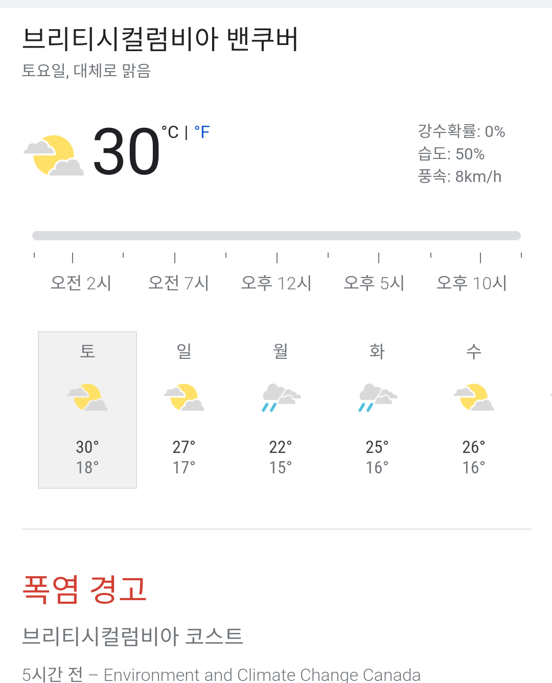 하루빨리 비가와야 할텐데….밴쿠버 날씨를 보니 다음주 월요일에 비가 올 예정입니다. 그러나 강수확률 60%에 광역성 소나기라고 합니다. 화요일 강수확률은 40% 입니다.