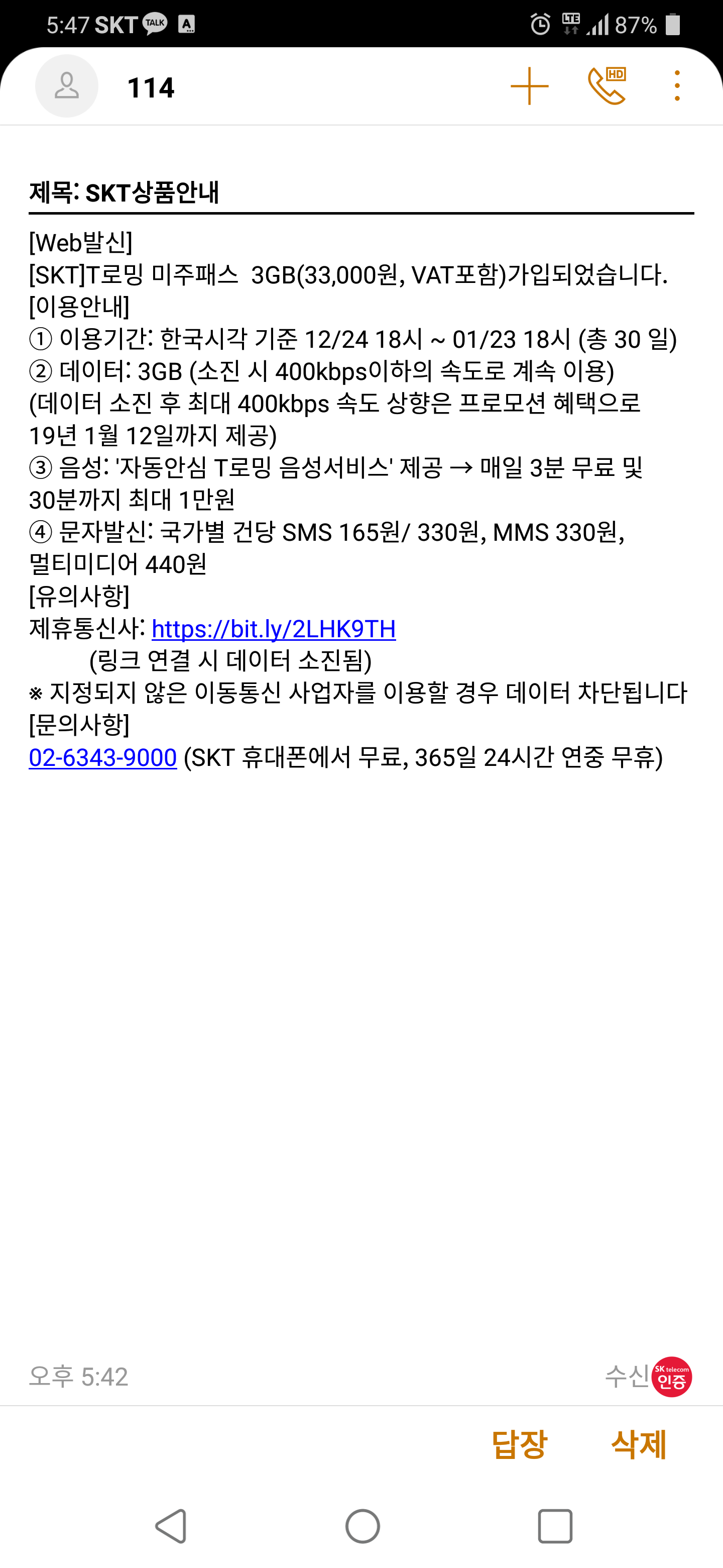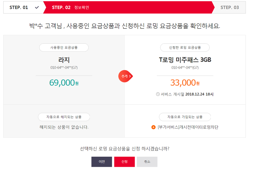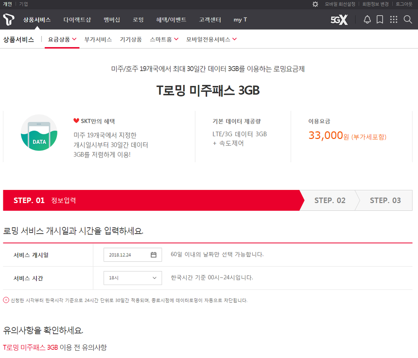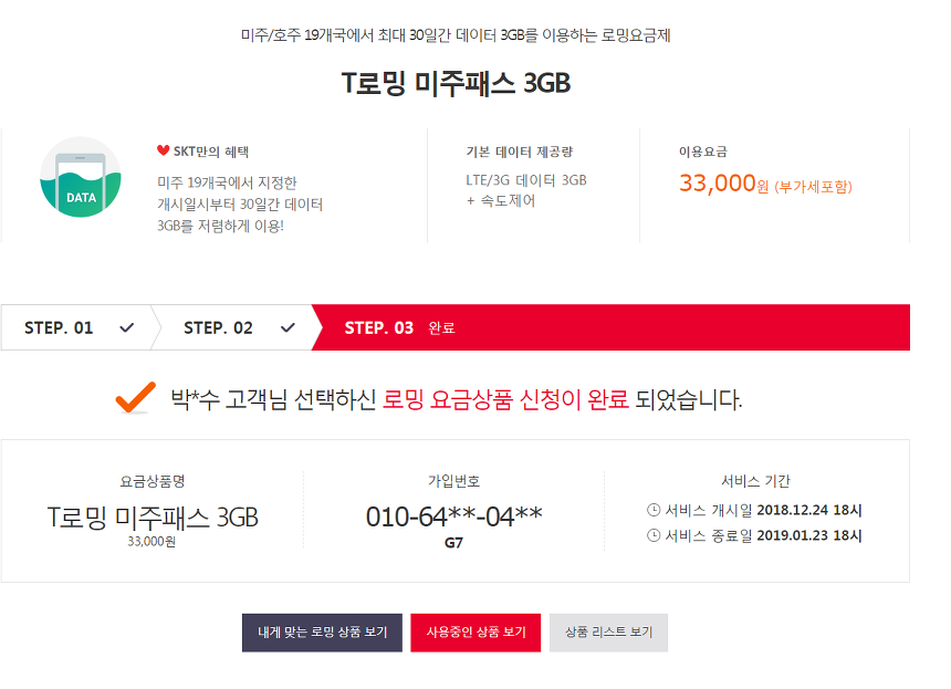 T로밍 서비스 ( 미주 패스 3GB) 이용하기