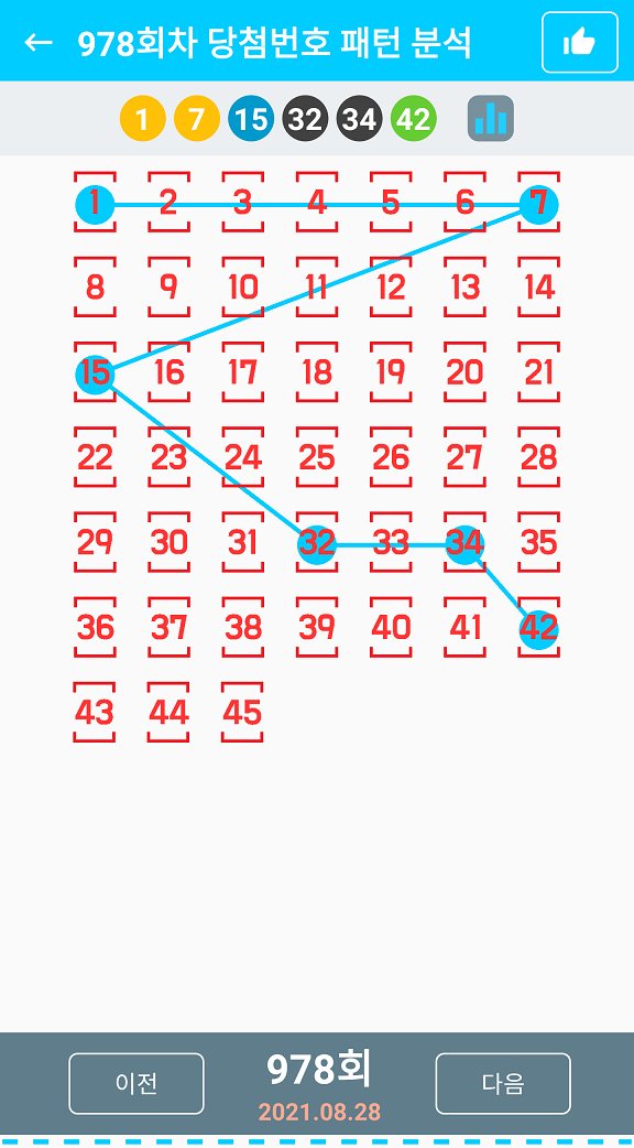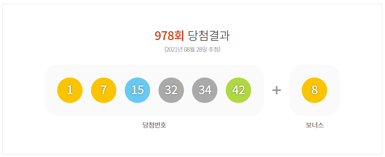 1등 로또 당첨번호는 1,7,15,32,34,42 (보너스 번호 8) 입니다