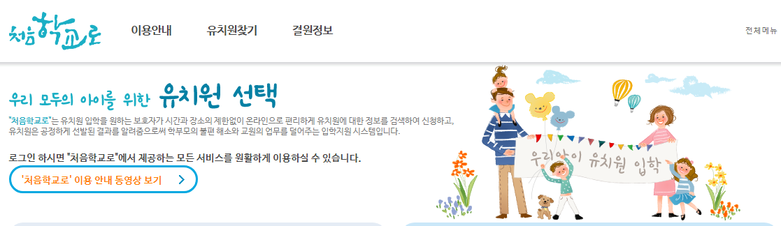 "처음학교로"는 유치원 입학을 원하는 보호자가 시간과 장소의 제한없이 온라인으로 편리하게 유치원에 대한 정보를 검색하여 신청하고, 유치원은 공정하게 설발된 결과를 알려줌으로써 학무보의 불편 해소와 교원의 업무를 덜어주는 입학지원 시스템입니다.