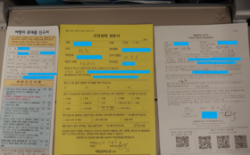 비행기 안에서 여행자 휴대품 신고서, 건강상태 질문서, 틀별검역 신고서 등 3개의 서류를 작성합니다.