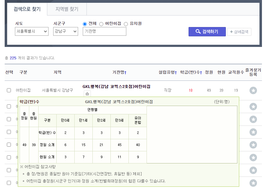 상세한 정보가 더 필요한 경우 현황표 아래쪽에 설명된 어린이집 유치원 통합정보공시 정보를 확인하세요.