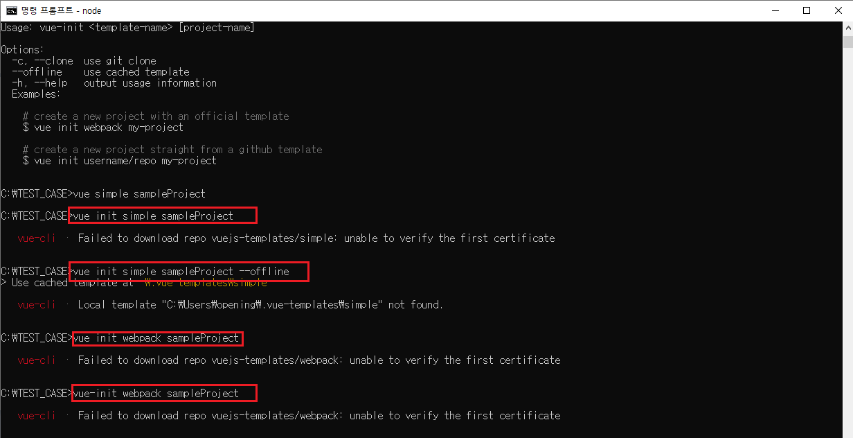 [뷰제이에스] vue-cli · Failed to download repo vuejs-templates/webpack: unable to verify the first certificate