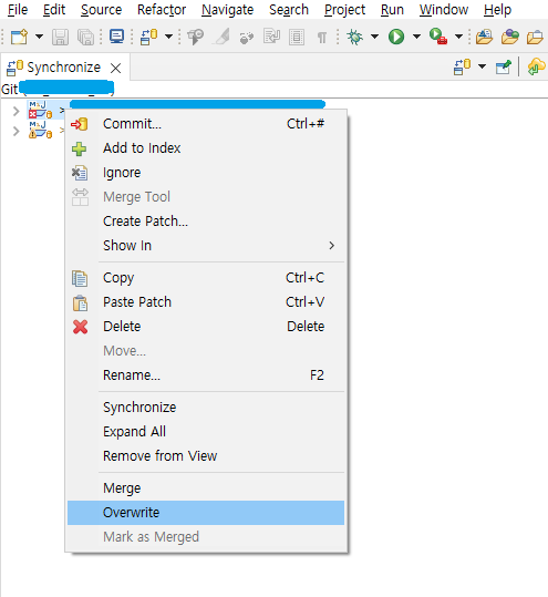 - Synchronize Workspace 메뉴 클릭하여 변경된 파일 리스트를 찾아줍니다.