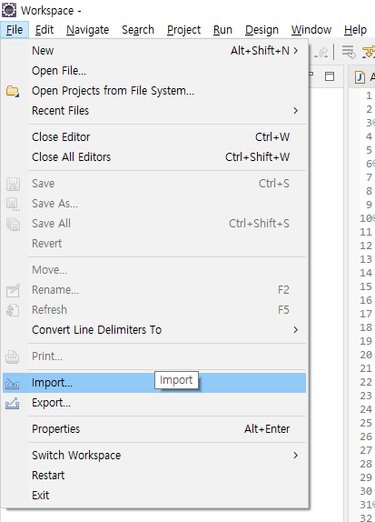 1. 이클립스 실행 후 > File 메뉴 클릭 > Import 클릭