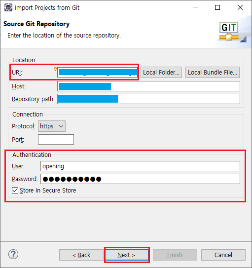 4. git저장소 위치의 URI를 입력하세요. Host와 Repository path는 자동으로 적용됩니다.