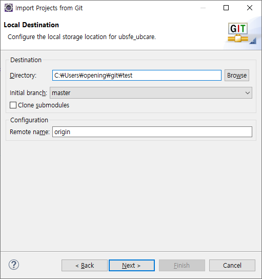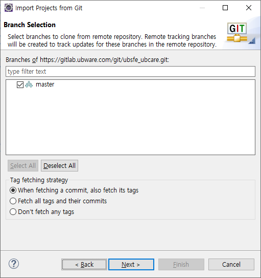 별도의 branch를 추가하지 않았다면 master를 선택 후 Next>