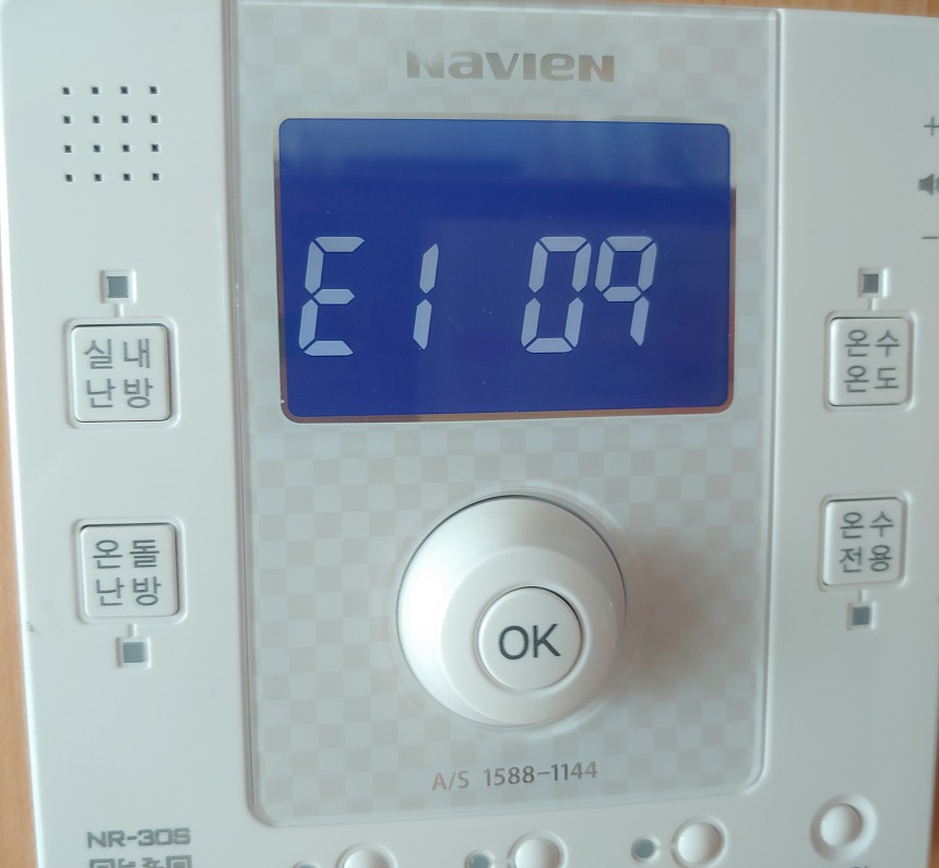 보일러 온도 조절기( 컨트롤러)에 E1 09 라는 코드 뜨며 “점검” 문구가 깜빡인다.